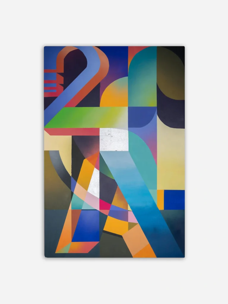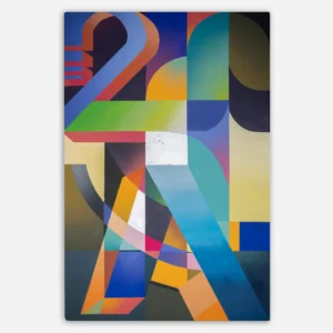 The graphic lines and overlapping shapes represent the vibrant energy of a modern city. This artwork tells the story of the interaction between buildings, infrastructure, and the people living in a bustling metropolis. The colors evoke an urban landscape at sunset, where the city itself seems to settle into a vibrant night. Each shape mirrors the rhythm of daily life, with its constant movement and interconnection, capturing the essence of a dynamic, ever-evolving urban environment.